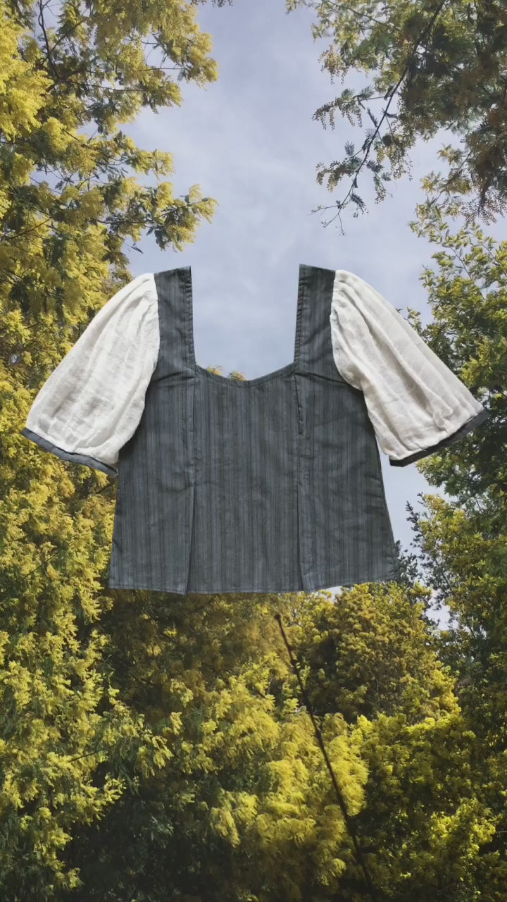Preciosa esta blusa! la tela de las mangas englobadas es gasa ligera y romántica. Disponible en tela café o rayada azul.